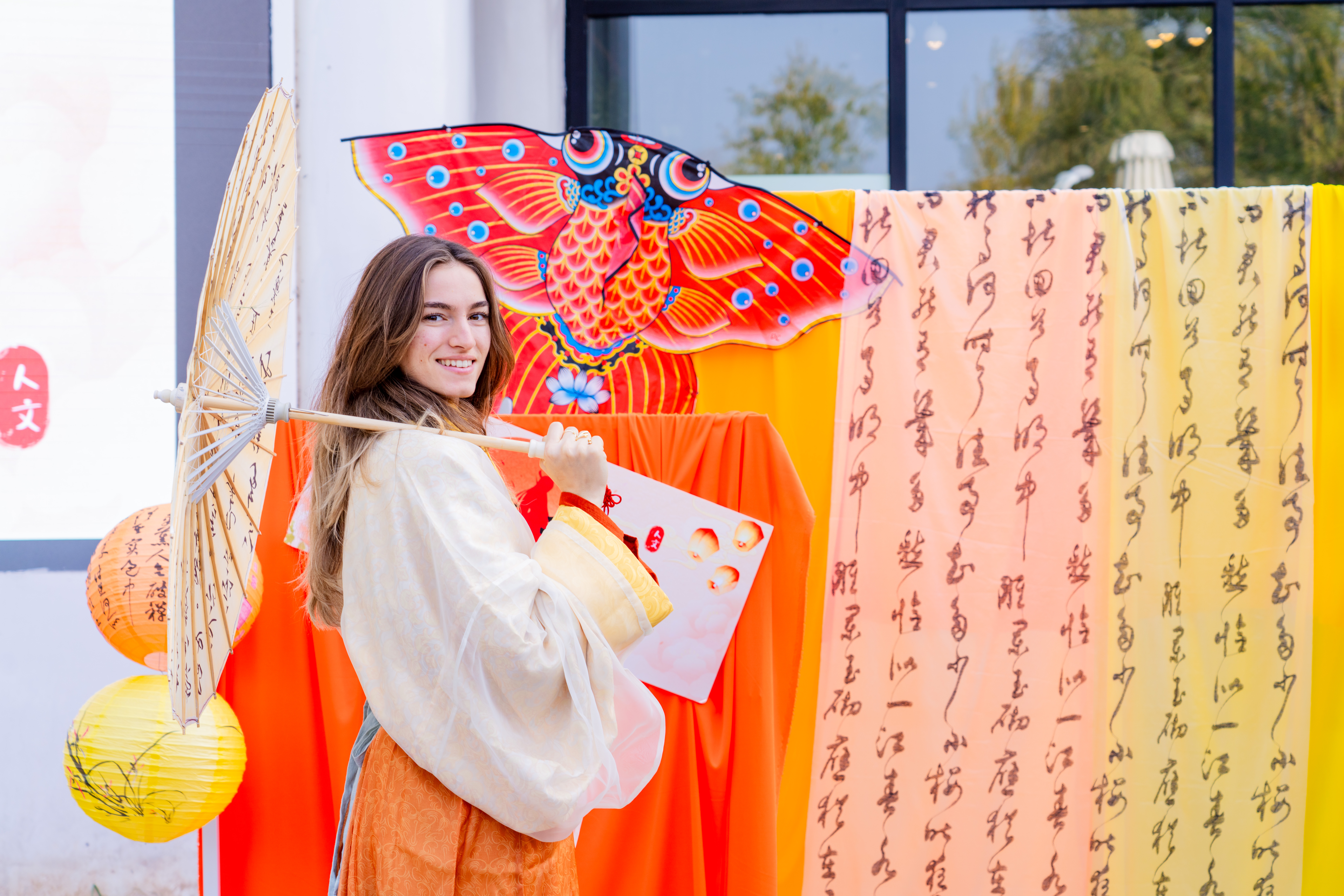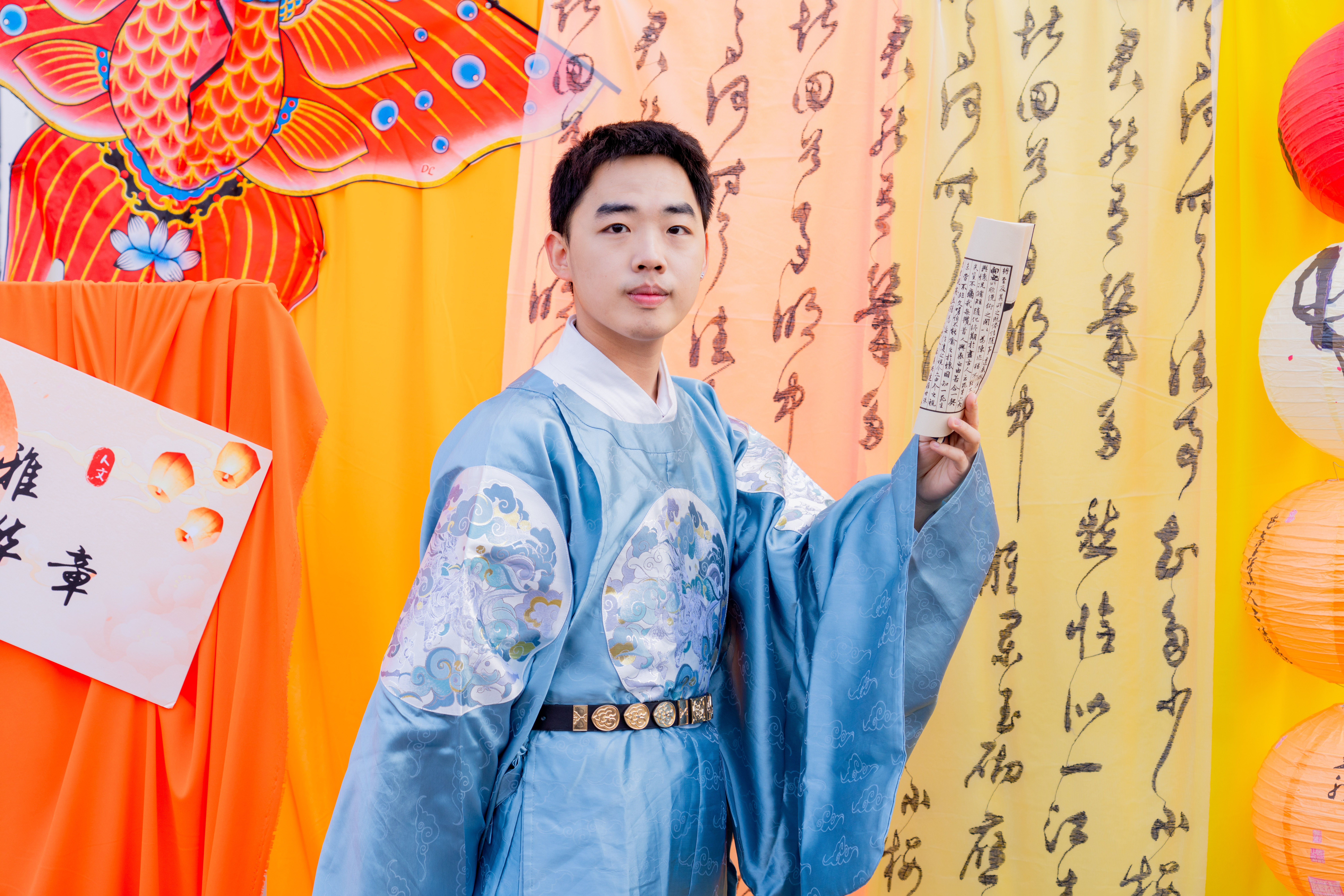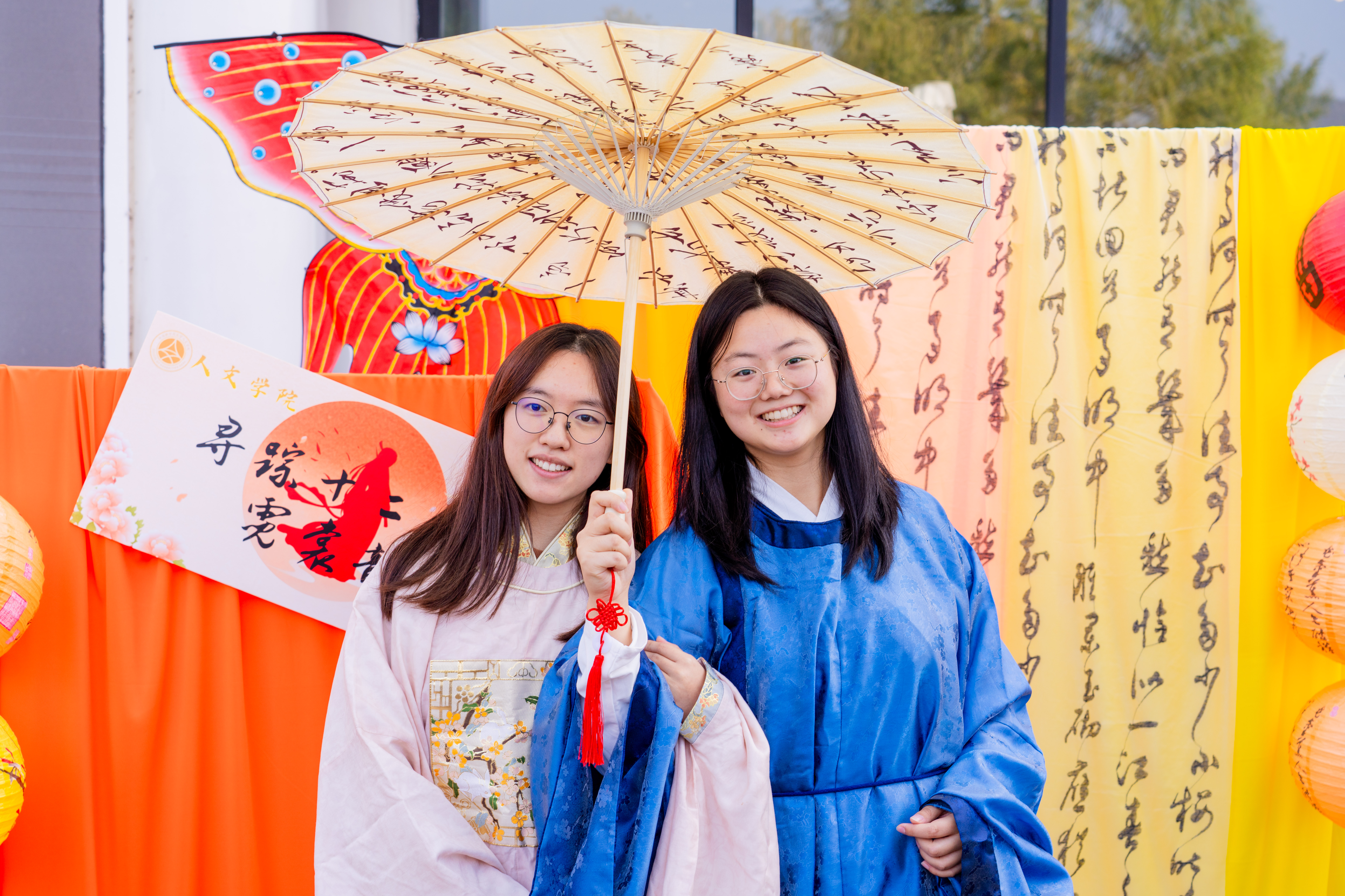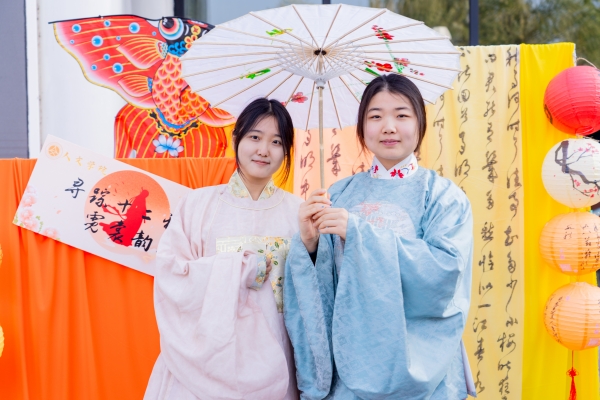 在本次文化节中,汉服摊位引领师生们穿越古今,领略锦绣中华的织绣之美。在摊主的细致讲解下,同学们不仅深入了解了历代服饰的形制特征与审美演变,更在摊主的协助下换上汉服,于活动特设的打卡点执纸伞、握书卷拍照留念,定格这难忘的瞬间。