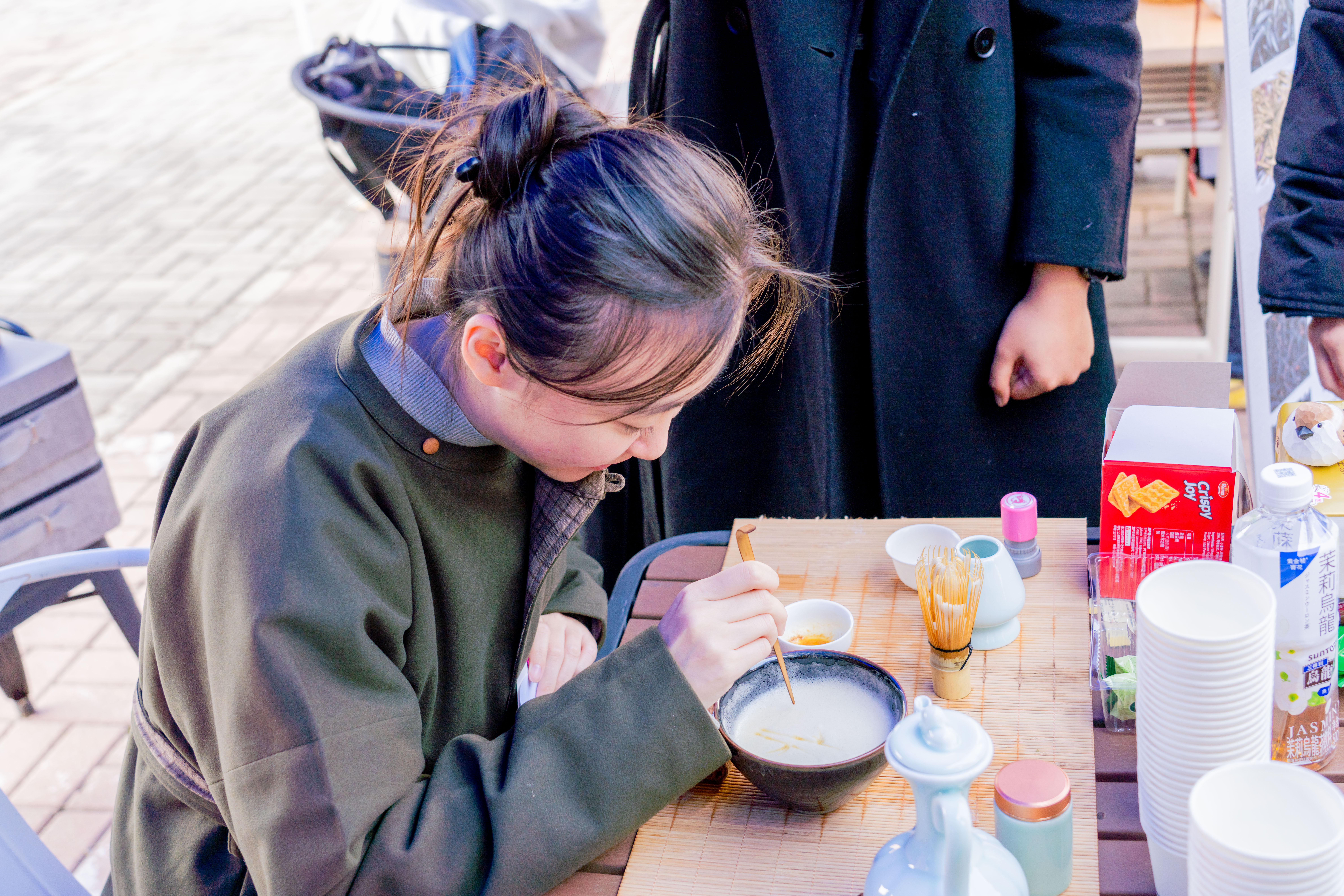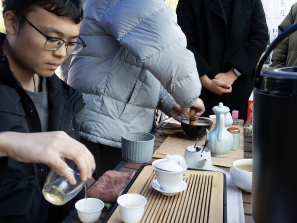 “无由持一碗,寄与爱茶人。”在茶艺摊位,摊主在展示洗茶、冲泡等传统技艺,带同学们品鉴绿茶、黑茶、白茶等各式茗茶的同时,还不忘为大家科普知识,如茶的产地、区别等等。同学们在举杯品茗间领悟茶韵,在欢声交谈间以茶交友,这也是本次文化节展摊的意义所在。