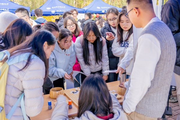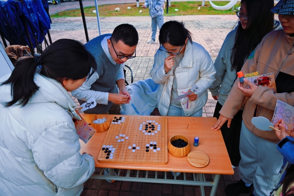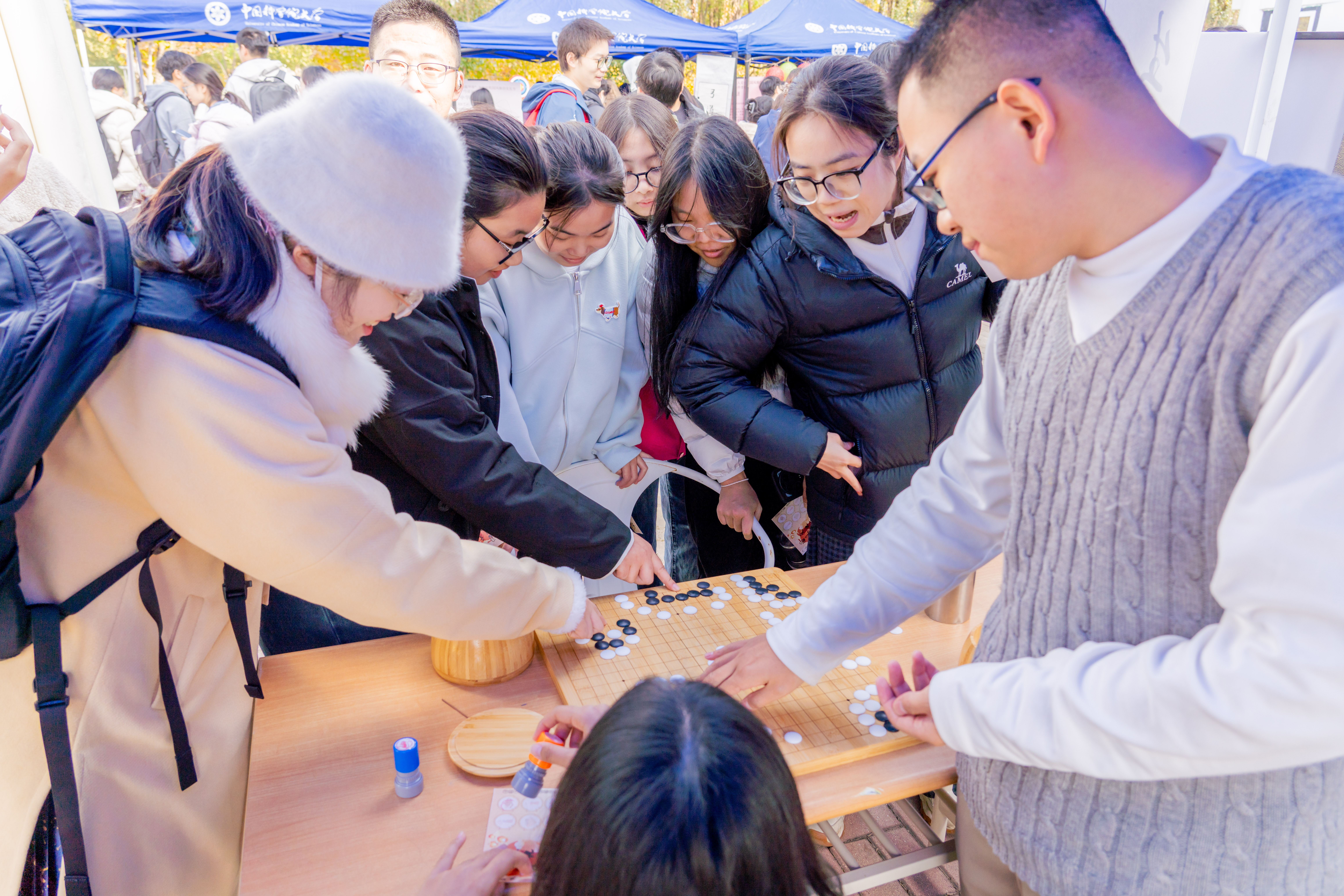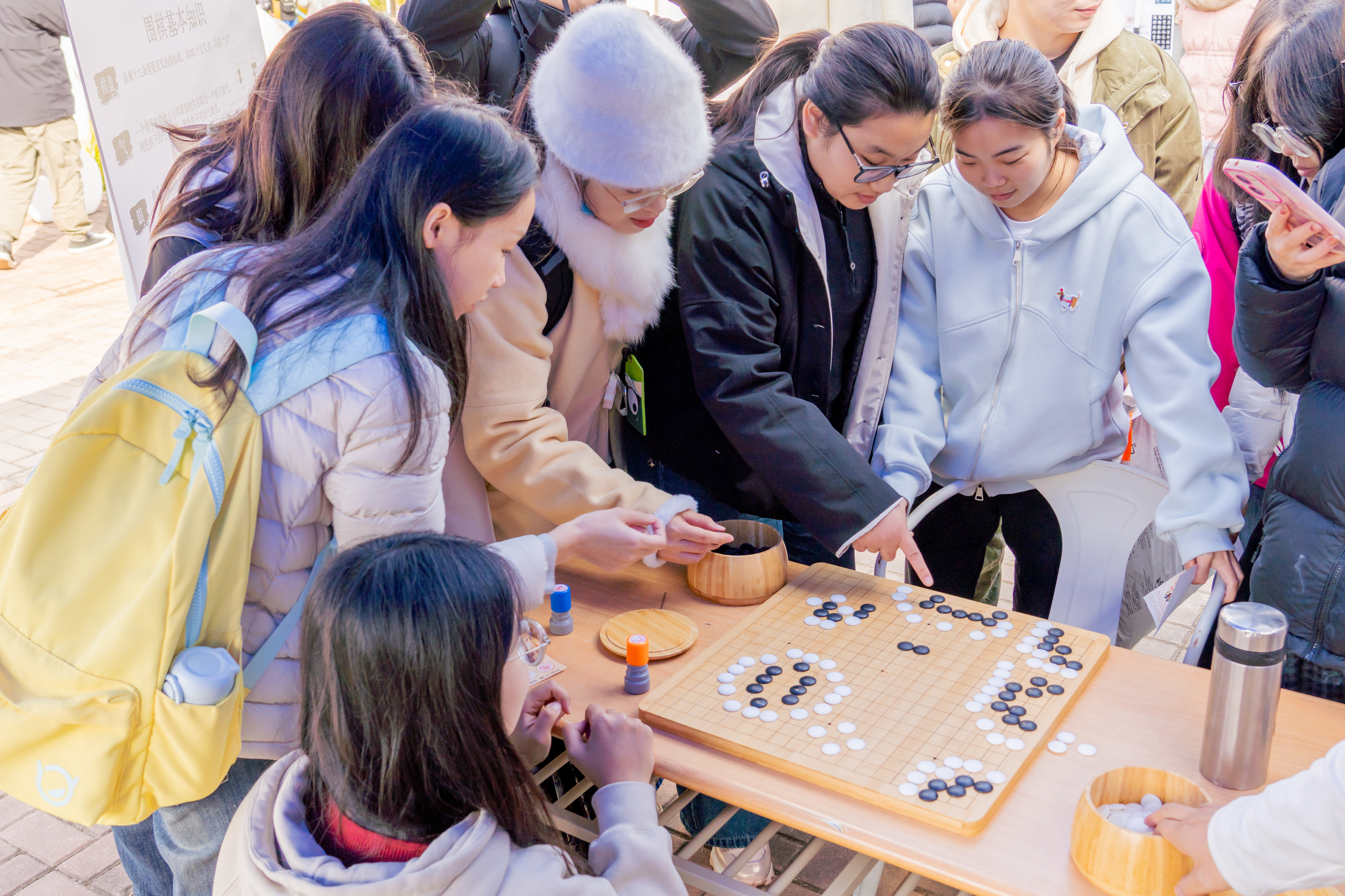 在围棋展区,摊主为同学们讲解了“气”、“眼”等围棋的规则与知识。初次接触围棋的同学们从最初的生涩尝试,到逐渐沉浸其中,深入感受着围棋艺术的千变万化,更有同学与摊主展开对弈。方寸棋盘之上,落子之声清脆,你来我往之间,不仅是技巧的切磋,更是文化的传递。