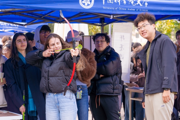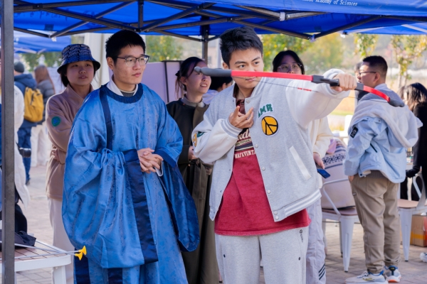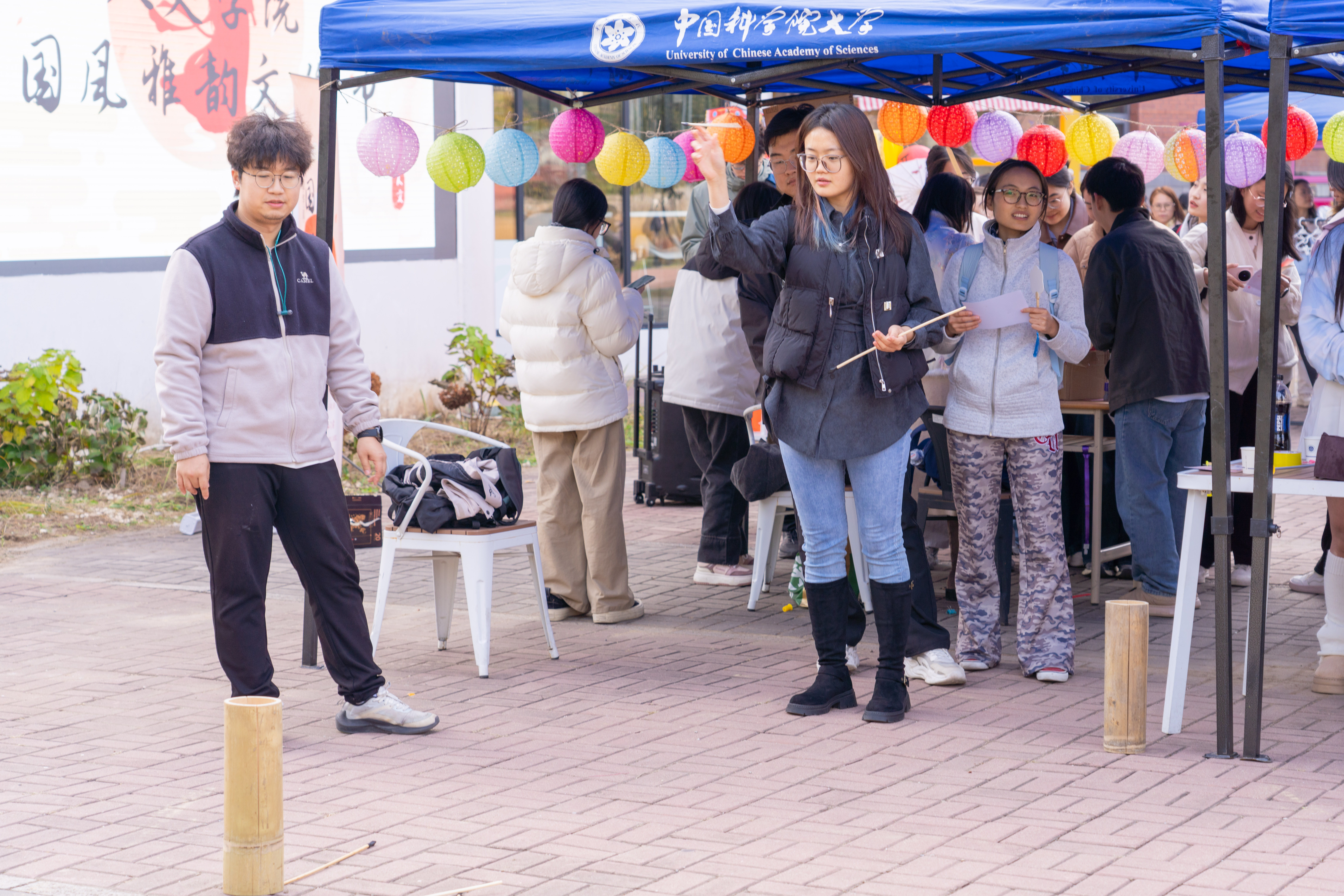 汉服翩翩,茶香弥漫;文墨挥洒,纹枰对弈;弓道射礼,妙趣横生;华灯竞处,古韵流长。2025年10月31 日下午,中国科学院大学人文学院于雁栖湖西区果壳咖啡北门前,以六大主题摊位拉开国风雅韵文化节的帷幕。活动伊始,人文学院学生赵琪身着淡粉襦裙,以一段中国舞舒展衣袖,翩跹舞姿间尽显古典气韵,为现场注入雅致氛围,引得台下掌声如潮。本次活动不仅设置汉服、书画、品茶、围棋、射艺、灯谜六大主题摊位,让参与人员能够沉浸式体验,还另设主题科普展板,摊主详解渊源,让体验不止于参与活动,更在于了解中华传统文化。