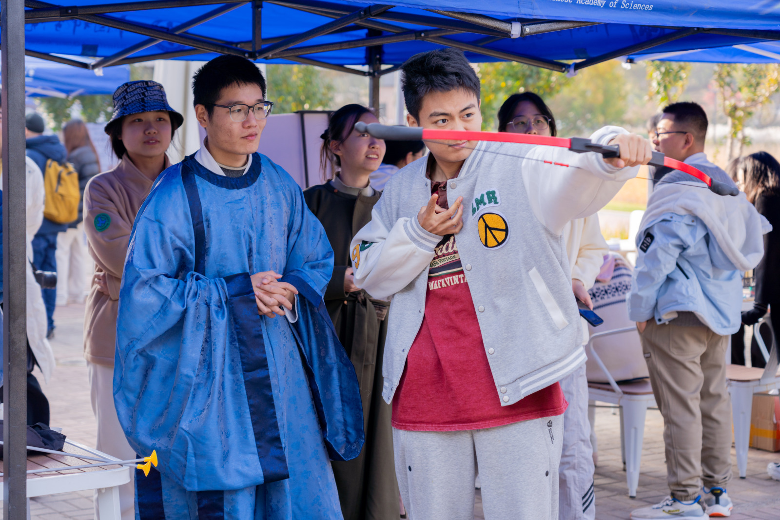 古语云:“养国子以道,乃教之六艺”,射艺乃“六艺”之一。本次射艺体验区吸引了大量同学排队一试身手。在摊主指导下,大家学习了握弓、搭箭、瞄准等基础动作。经过一番练习,同学们渐入佳境。不少同学一箭中鹄,参与者们纷纷惊叹。此外,射艺展区还设置投壶游戏环节。不少参与者表示投壶这项源自中国古代宴饮的投掷游戏,虽然看上去简单,但直到亲身实践才领悟到古语“投壶,射之细也”的含义所在。