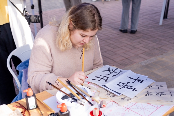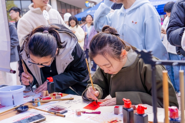 笔墨丹青是中华传统文化里流淌千年的雅致符号,也是本次文化节的 “诗意角落”。在书画摊位,参与者可在书画摊位尝试亲手制作书画作品,亦可请摊主帮忙书写自己心怡的书签、团扇及卷轴等物品,最后再盖上摊位特制的印章,朱红印泥与墨色交织,让每一件作品都沾染上古朴的仪式感。格外动人的是,不少国际留学生被案上的笔墨吸引,他们在摊主的耐心引导下,先学握笔的 “指实掌虚”,再慢慢琢磨笔画的轻重 —— 有人从最简单的 “平” 字练起,直到能工整写下 “平安喜乐”“金榜题名”,完成后举着自己的作品拍照,连说 “原来汉字不仅是文字,还是好看的艺术”。