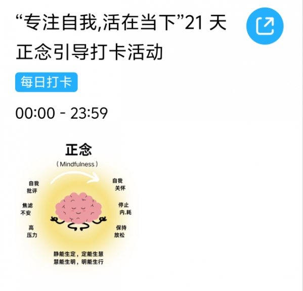 随后的线上正念打卡活动中,许多同学坚持每日练习,在呼吸之间观照内心,于忙碌日常中寻回片刻安宁。每一天的签到,都是一次温柔的自我关照,也让陪伴跨越了时空的距离。