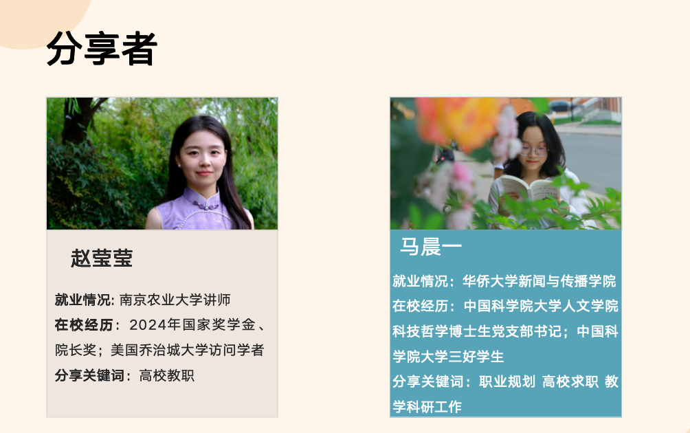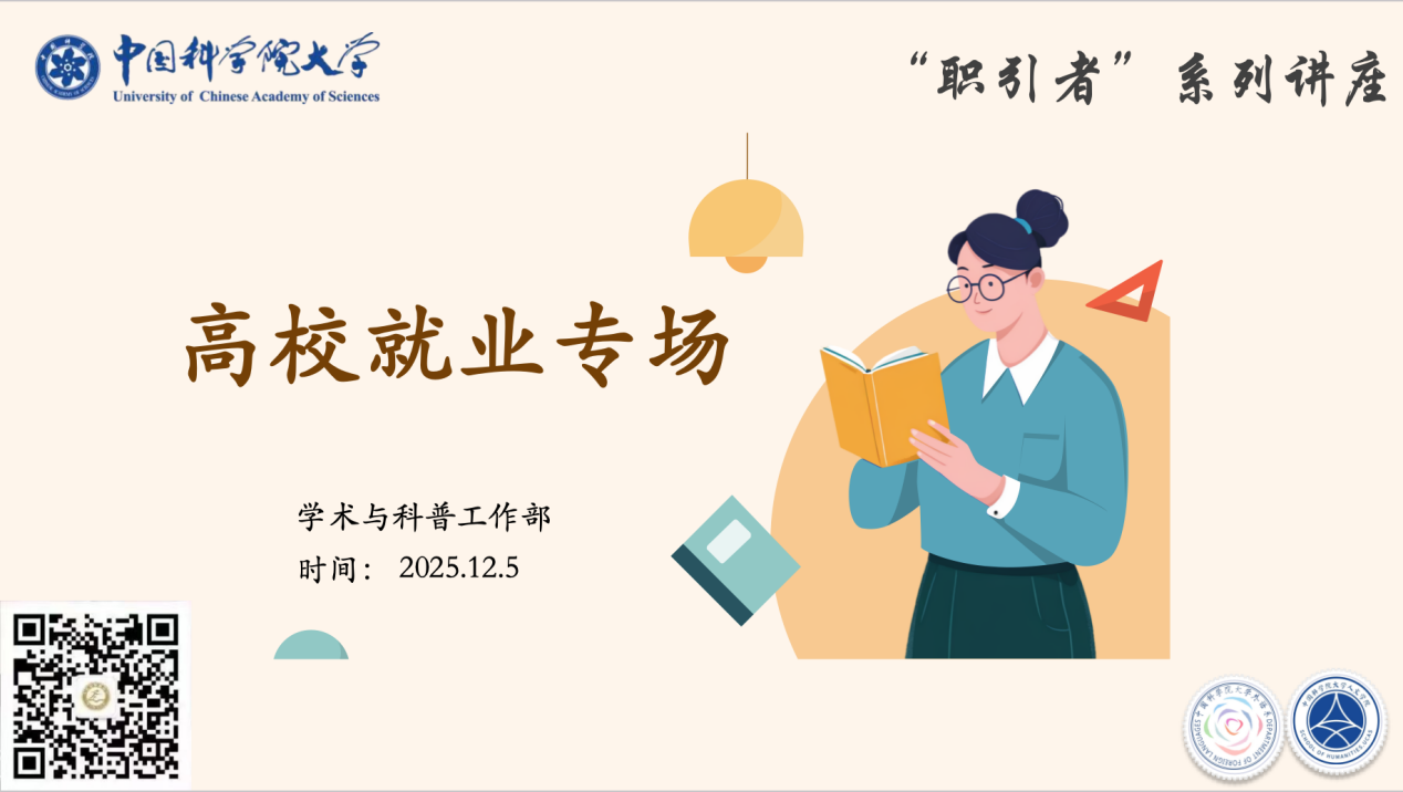 2025年12月5日,由中国科学院大学人文学院团委和“职引者”工作室主办,中国科学院大学人文学院学生会、外语系学生会联合承办的新一期“职引者”系列讲座成功举办。本期分享主题为“高校就业”,特别邀请了科学技术哲学2022级博士赵莹莹、科学技术哲学2022级博士马晨一两位嘉宾,她们围绕高校教职基本情况、求职准备、面试经验及工作体会等内容进行了全面而细致的分享。