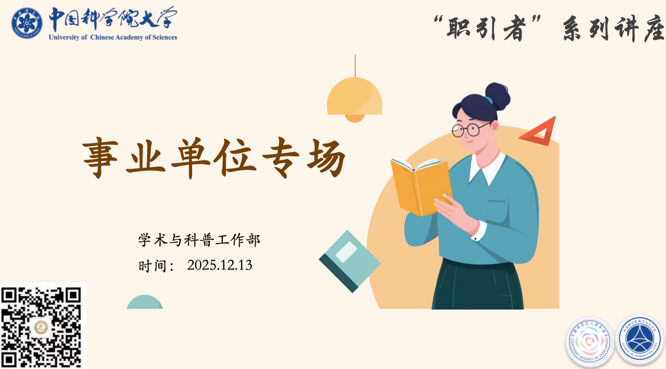 2025年12月13日,由中国科学院大学人文学院团委和“职引者”工作室主办,中国科学院大学人文学院学生会、外语系学生会联合承办的新一期“职引者”系列讲座成功举办。本期分享主题为“事业单位”,旨在为有志于进入事业单位工作的同学们提供实用的求职指导和经验分享,帮助大家更好地了解事业单位的招聘流程、工作内容及职业发展前景。特别邀请了外语系2023级英语口译专业硕士边颖、张奕欣两位嘉宾,她们围绕求职规划、备考经验、面试经验及工作体会等内容进行了细致的分享。