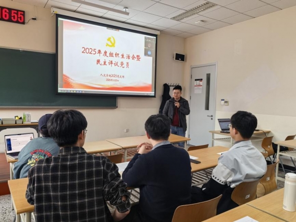 2026年3月20日,人文学院2025党支部在雁栖湖校区教一楼223教室开展了2025年度党支部组织生活会暨主题党日活动。会议由支部书记谢梦珍主持,支部全体党员及部分党外群众参加会议,人文学院党委委员罗武干老师和班主任唐桑圆老师列席。