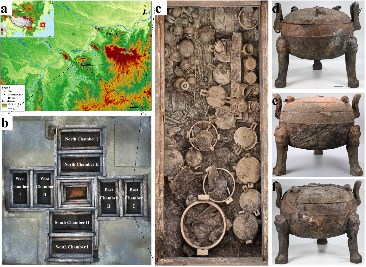近日,中国科学院大学人文学院考古学与人类学系(齐彬杰、杨益民)、国家文物局考古研究中心(张治国、宋佳航)与安徽省文物考古研究所(方玲)等单位合作,以安徽淮南武王墩一号墓出土的青铜鼎内土样为对象,利用气相色谱-质谱联用技术(GC-MS),对21件青铜鼎内部沉积物及环境对照土壤样本进行了分析。在四件青铜器中检测到了龙涎香的特征化学成分,提供了目前已知最早的龙涎香使用分子证据。研究成果以“Organic residue analysis reveals the use of ambergris in a late Warring States royal tomb”为题,发表于国际文化遗产研究领域一流期刊《npj Heritage Science》。