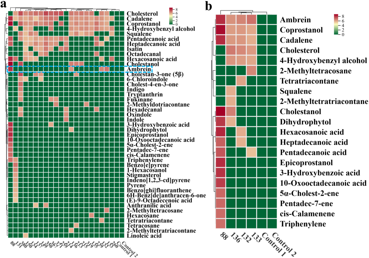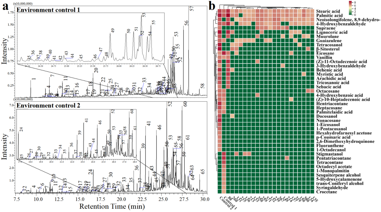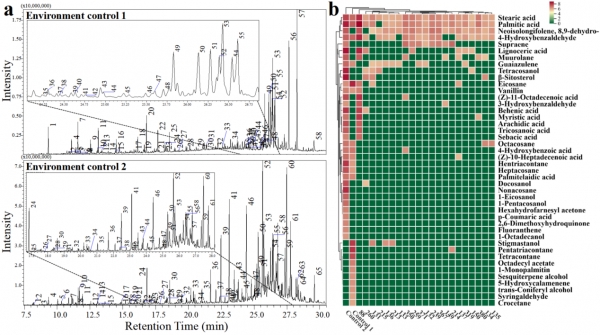 通过对比环境样本和青铜鼎残留物中的有机成分,发现环境土壤中存在大量植物和微生物来源的化合物。然而,聚类热图分析表明,部分青铜鼎内部残留物的化学特征受环境影响较小(图2),说明它们仍保留了原始盛放物的特征。