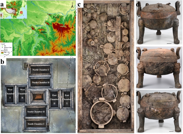 研究首先对武王墩一号墓(公元前3世纪晚期)东一室出土的21件带盖青铜鼎进行采样(图1)。这些鼎内部附着的沉积物可能保存了容器原始盛放物质的有机成分。为了排除墓葬环境污染,研究人员同时采集了墓室上部填土和青铜器附近的土样作为环境对照。