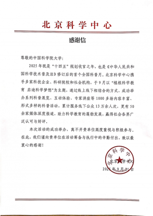 近日,人文学院收到北京科学中心发来的感谢信。信中对我院在北京科学中心全民科普月系列活动中的付出,以及我院师生的积极配合致以诚挚感谢。